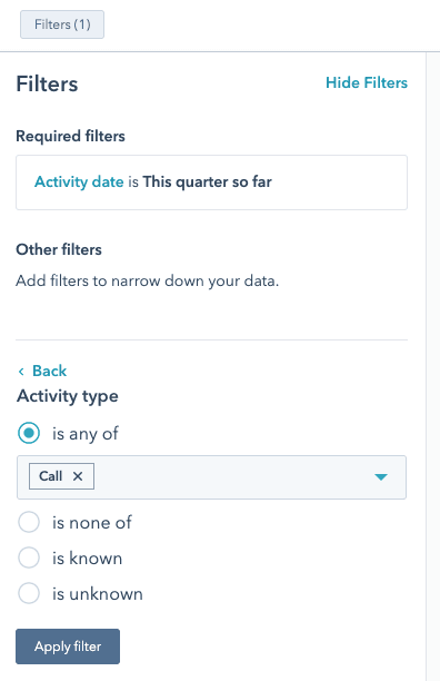 Haz clic en Filtros, establece tu periodo y luego haz clic en Agregar filtro > Tipo de actividad > es cualquiera de: Llamada.
