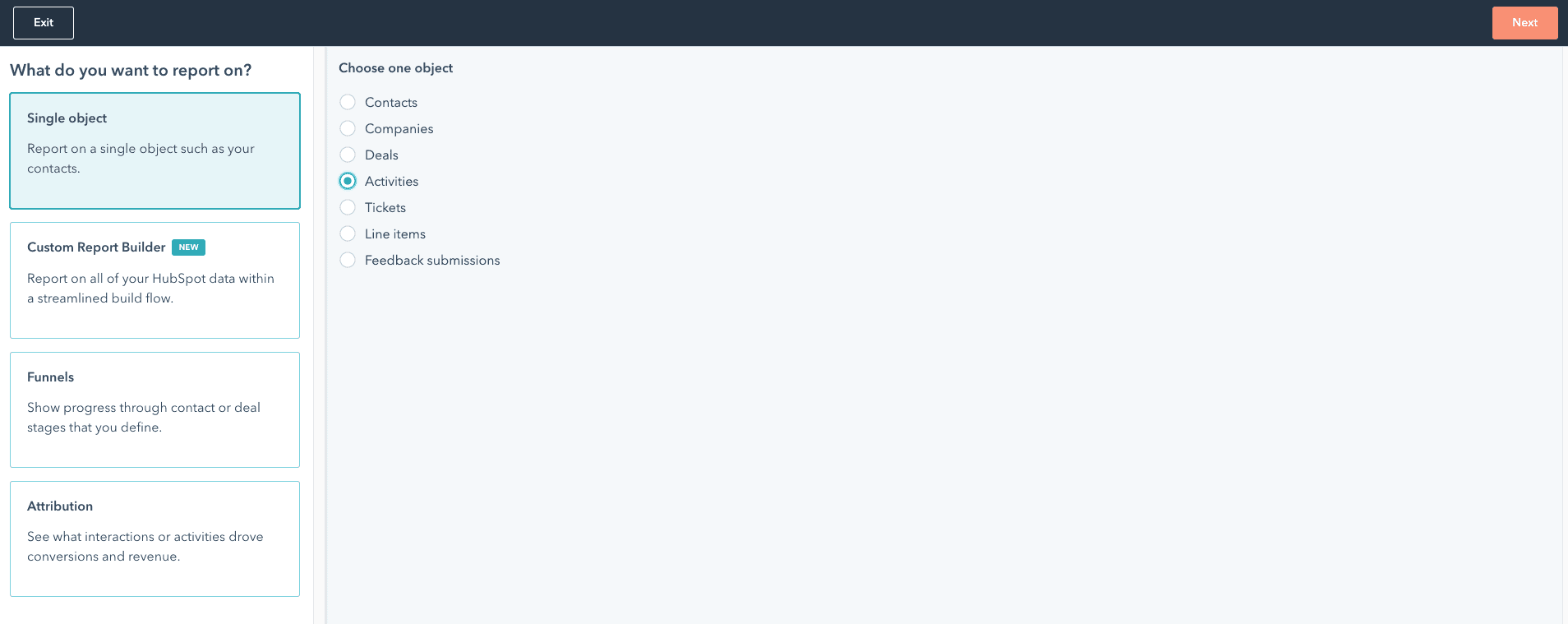 Selecciona Objeto único, elige Actividades y luego haz clic en Siguiente.