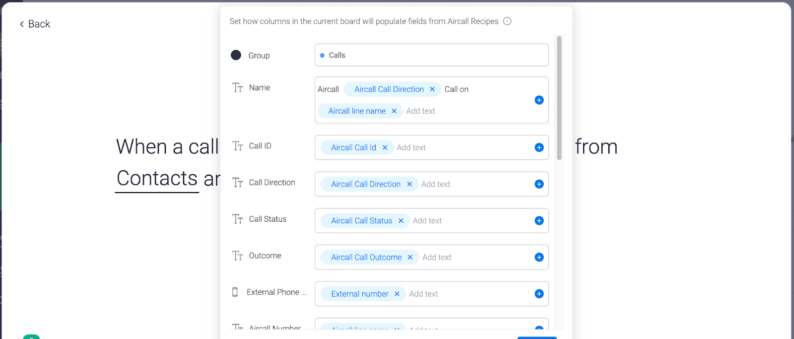 Después de seleccionar Llamada para la primera opción de asignación, se te pedirá que asignes los campos de datos de Aircall a las columnas de tu tablero de Llamadas de Aircall.