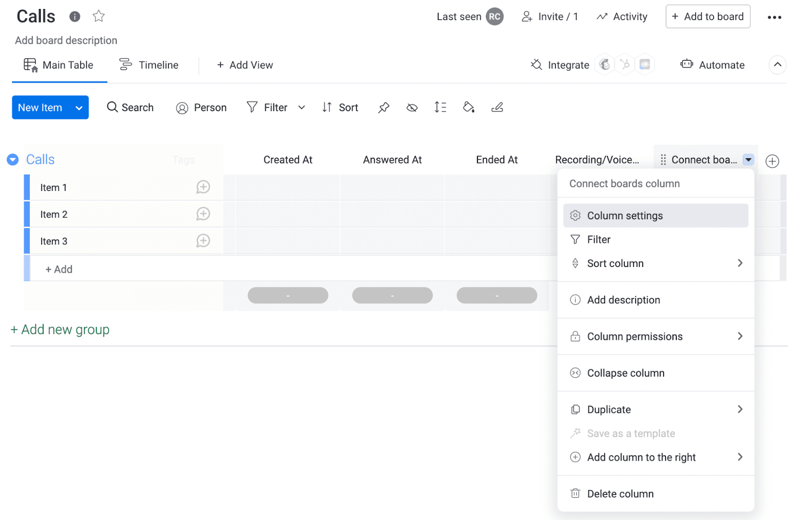 Después de la asignación, elige a qué tablero deben vincularse tus llamadas, como tu tablero de Contactos o cualquier tablero que contenga números de teléfono.