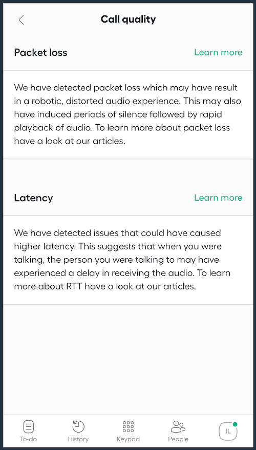 Si ocurrió un problema de calidad durante tu llamada, puedes revisar información diagnóstica detallada después de que la llamada termine.
