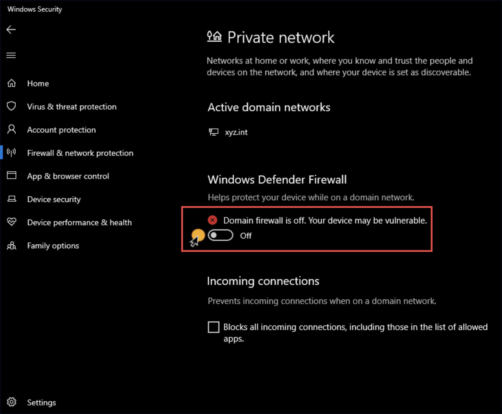 - En Firewall de Windows Defender, cambia el interruptor a Desactivado.