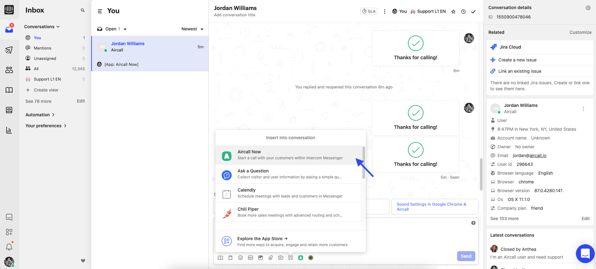 Una vez conectado, la aplicación Aircall Now estará lista para usarse en tus conversaciones de Intercom Messenger.