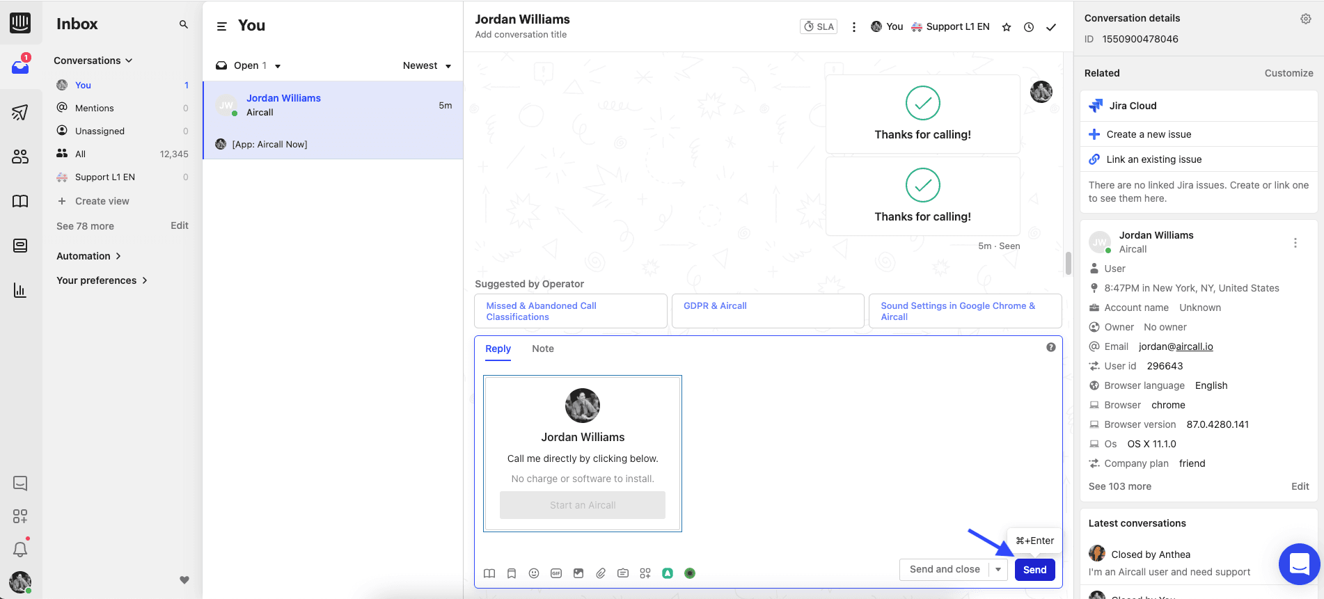 - Cuando aparezca la tarjeta de Aircall Now, haz clic en Enviar.