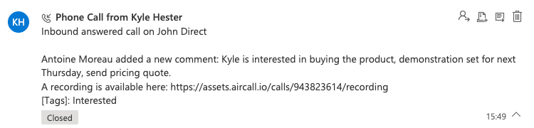 Cada llamada de Aircall se registra como una Actividad en la línea de tiempo del Contacto o Lead correspondiente. Aircall coincide con el llamante o receptor basándose en cualquier número de teléfono guardado en Microsoft Dynamics.