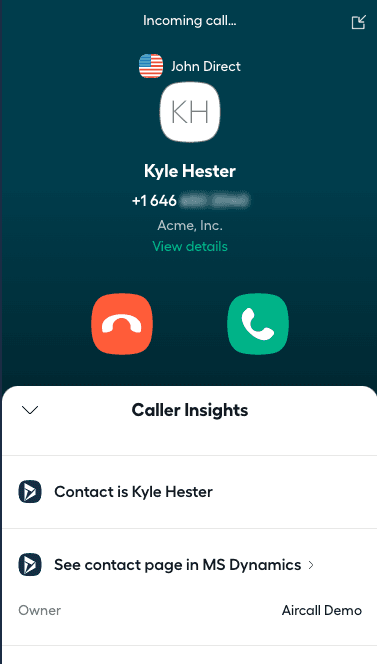 Las Tarjetas de Información de Aircall muestran información del llamante y un enlace directo a su página de Contacto o Lead en Dynamics tan pronto como suena el teléfono o mientras el agente está en una llamada.