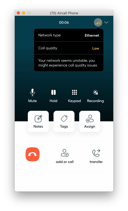 Cuando estás en una llamada, es común que las conexiones de red locales cambien. Esto puede afectar en gran medida la calidad de tu llamada e impactar tu flujo de trabajo. Con Aircall, puedes comprobar el estado de tu red mientras estás en una llamada mediante la función de gestión de red durante la llamada en la aplicación Phone.