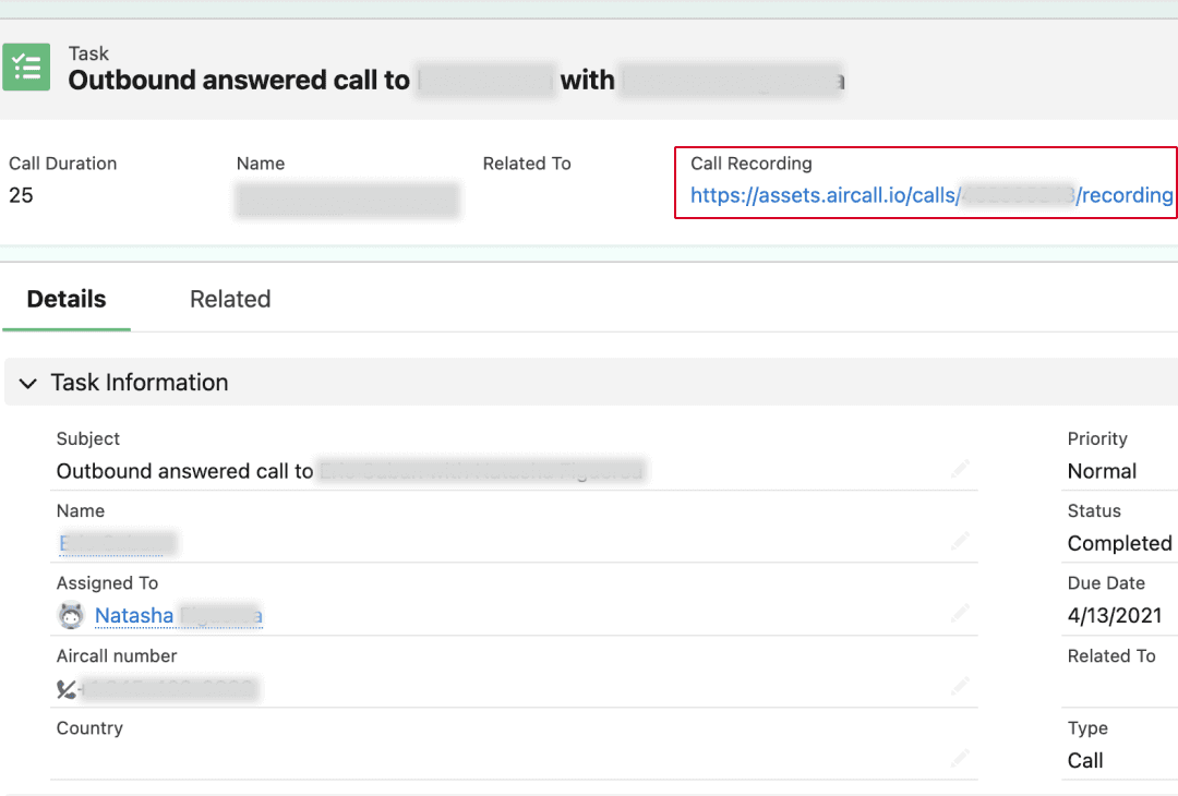 En algunas integraciones de CRM y Helpdesk, el enlace del recurso para una grabación o mensaje de voz se registra después de una llamada, permitiéndote hacer clic y abrir el enlace del Panel de Aircall desde tu registro de llamadas.