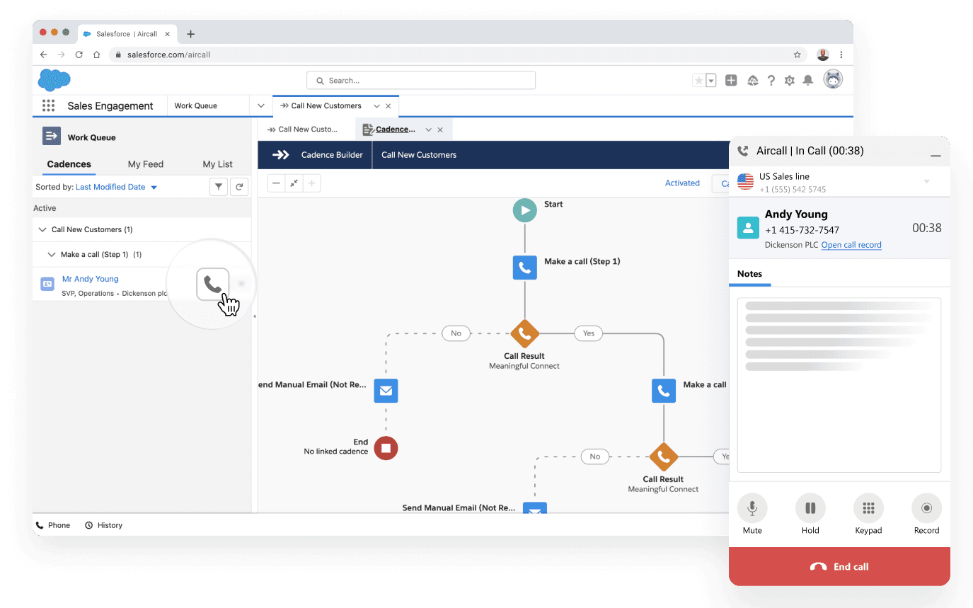 Realiza cientos de llamadas diarias con Aircall para Salesforce Sales Engagement. Aumenta la productividad de tu equipo con el registro automático de llamadas, CTI de carga rápida, Acciones Rápidas, el Aircall Voice Object y mucho más.