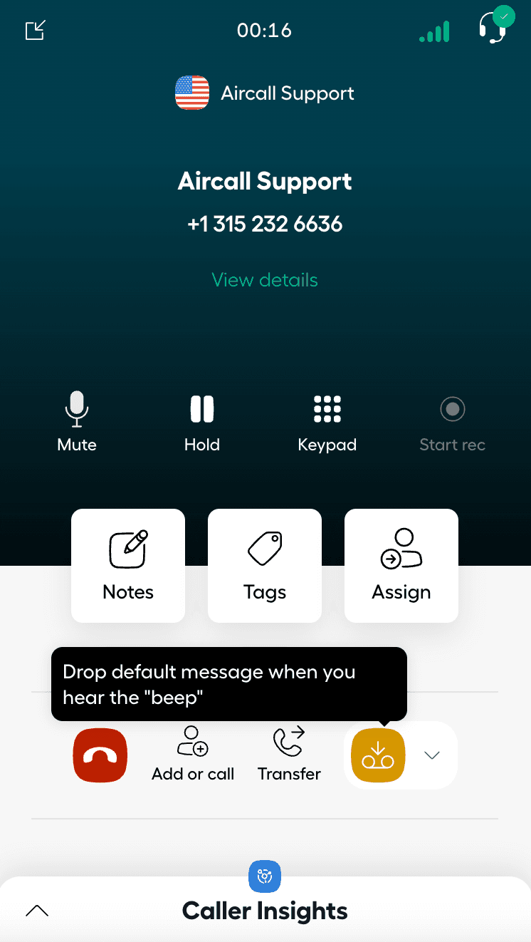 ⚠️ Ten en cuenta que este artículo proporciona información sobre Voicemail Drop, con imágenes de la aplicación Aircall Phone. Aunque la información de la función aquí es relevante para Aircall Workspace, también visita Aircall Workspace - Configuración de llamadas para información sobre Aircall Workspace.