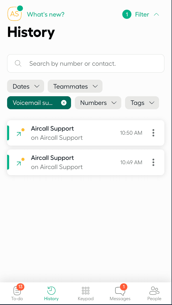 Al ver la pestaña Historial, puedes identificar fácilmente una llamada saliente con voicemail drop con el nuevo icono colocado delante de ella: