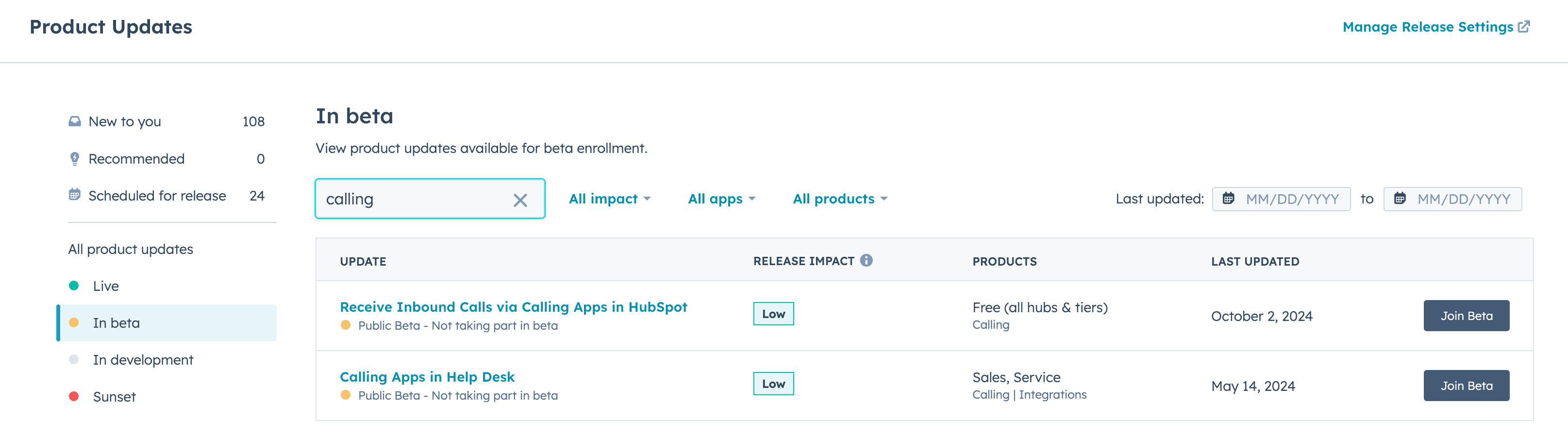 Debes inscribirte en la beta de Aplicaciones de Llamadas en Help Desk en HubSpot.
