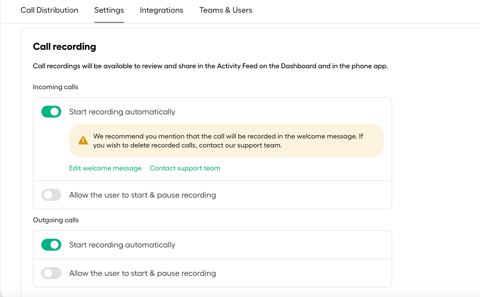 Sí. Puede habilitar la grabación automática para cualquier número desde el Panel de Aircall y restringir el control por parte de los agentes.