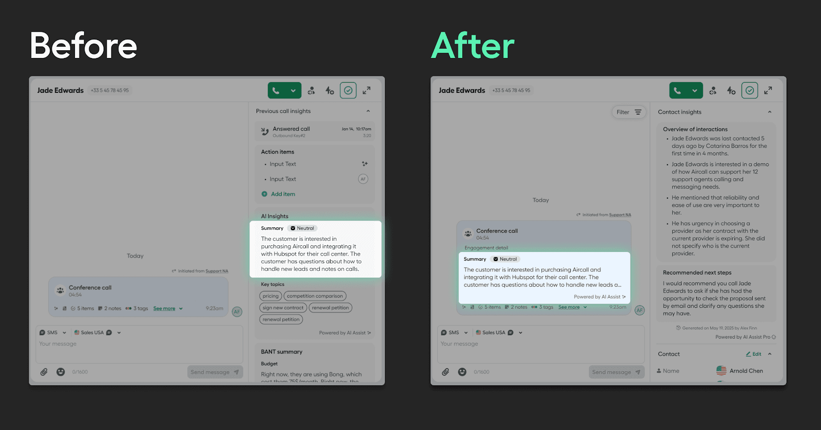 - Los resúmenes de llamadas ahora reflejan las conversaciones con una precisión del 97-100 %, duplicando la fiabilidad de las versiones anteriores. Tu equipo puede confiar en los resúmenes para actuar rápidamente y con confianza.