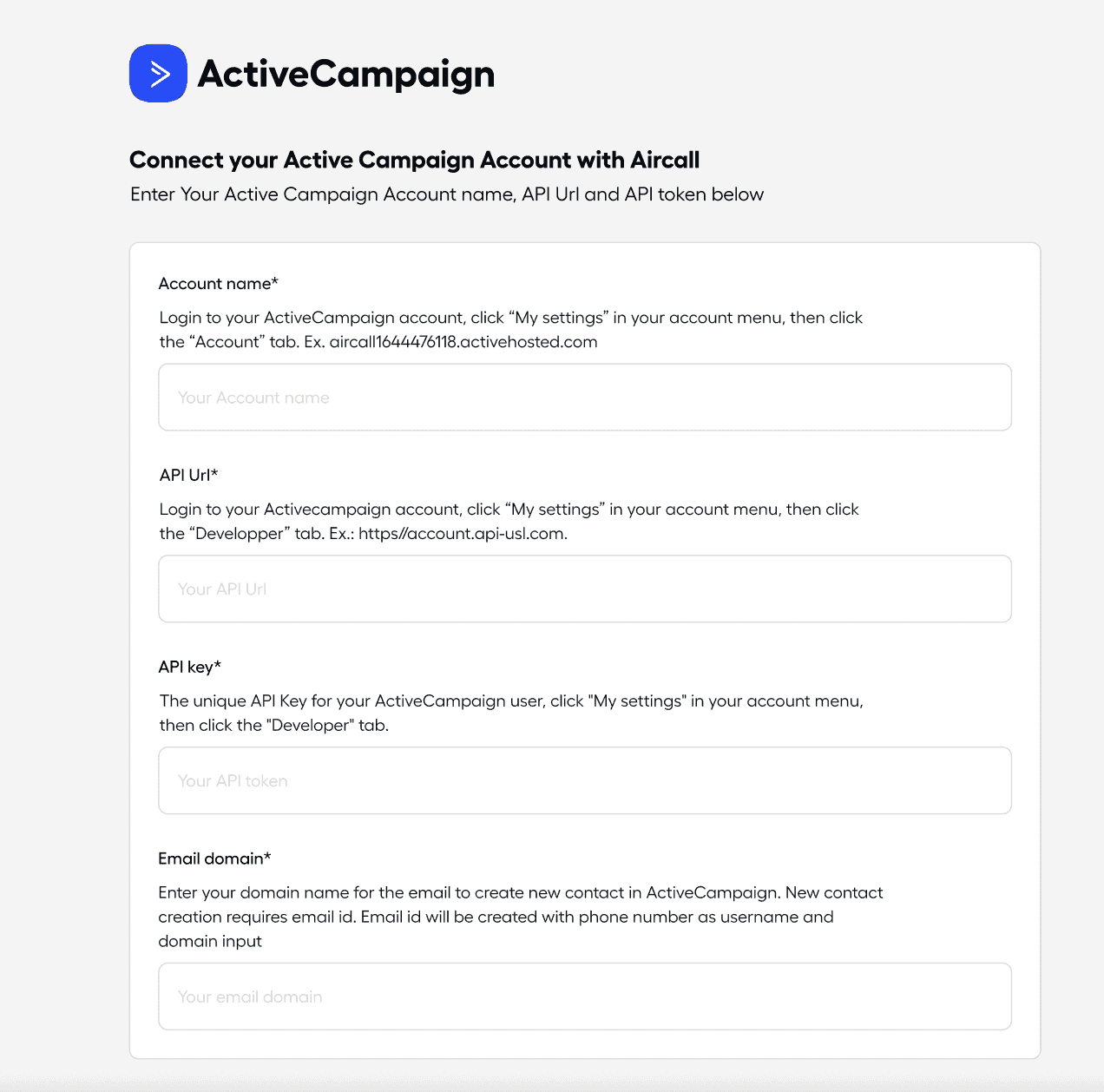 - Domaine e-mail : Il s'agit d'un domaine e-mail fictif qui sera utilisé pour renseigner le champ e-mail lorsqu'un nouveau contact est créé dans ActiveCampaign à partir d'un appel. Vous pouvez utiliser n'importe quel domaine e-mail factice, mais vous devez en choisir un avant de continuer.