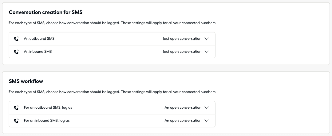 Choisissez, pour chaque type de SMS, comment les conversations doivent être enregistrées, comment les conversations doivent être enregistrées