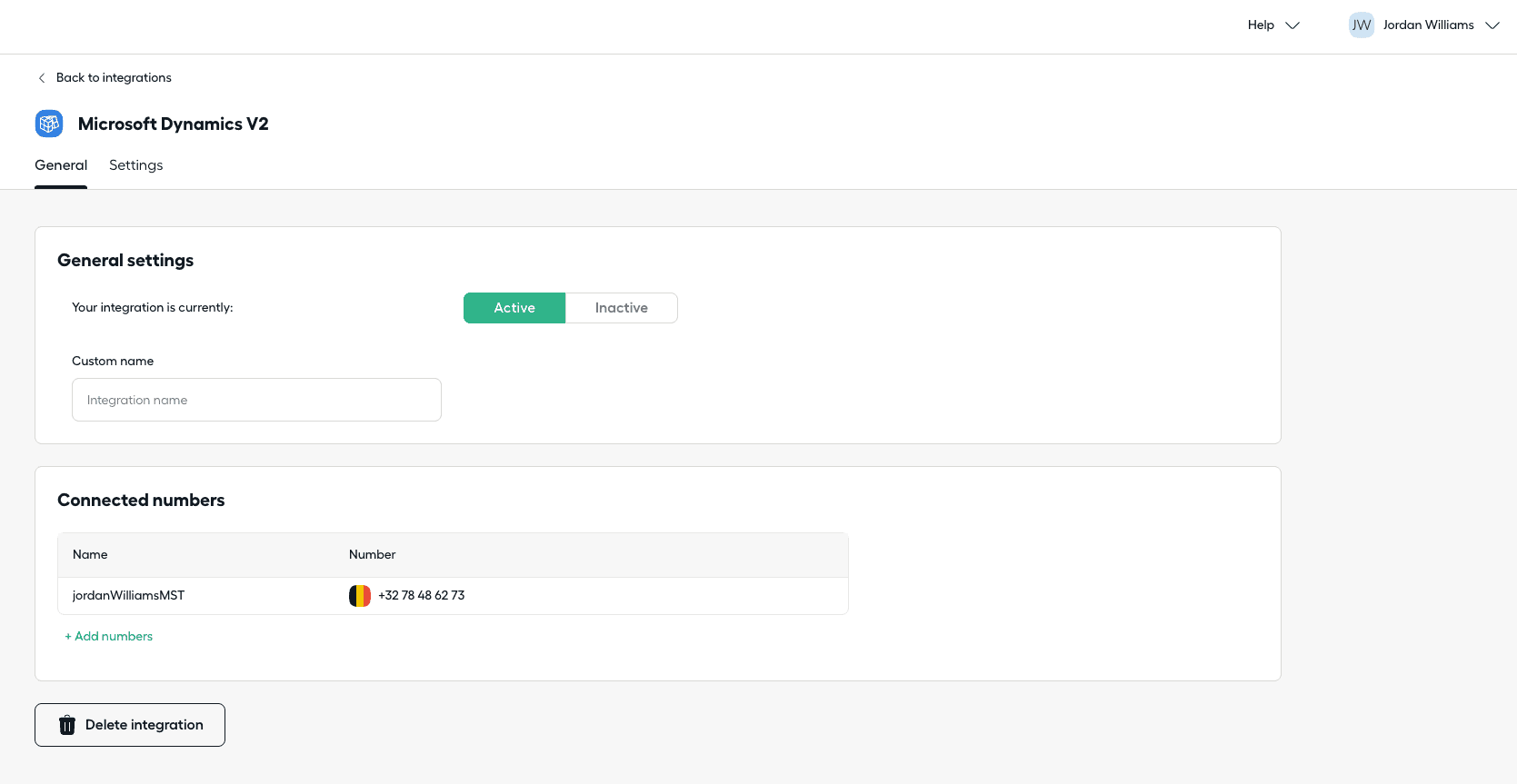 Vous pouvez ajouter des numéros à votre intégration sous l’onglet Général, dans la section Numéros connectés. Pour plus d’informations sur la façon d’ajouter des numéros, veuillez consulter notre article Attribuer votre numéro de téléphone à votre intégration.