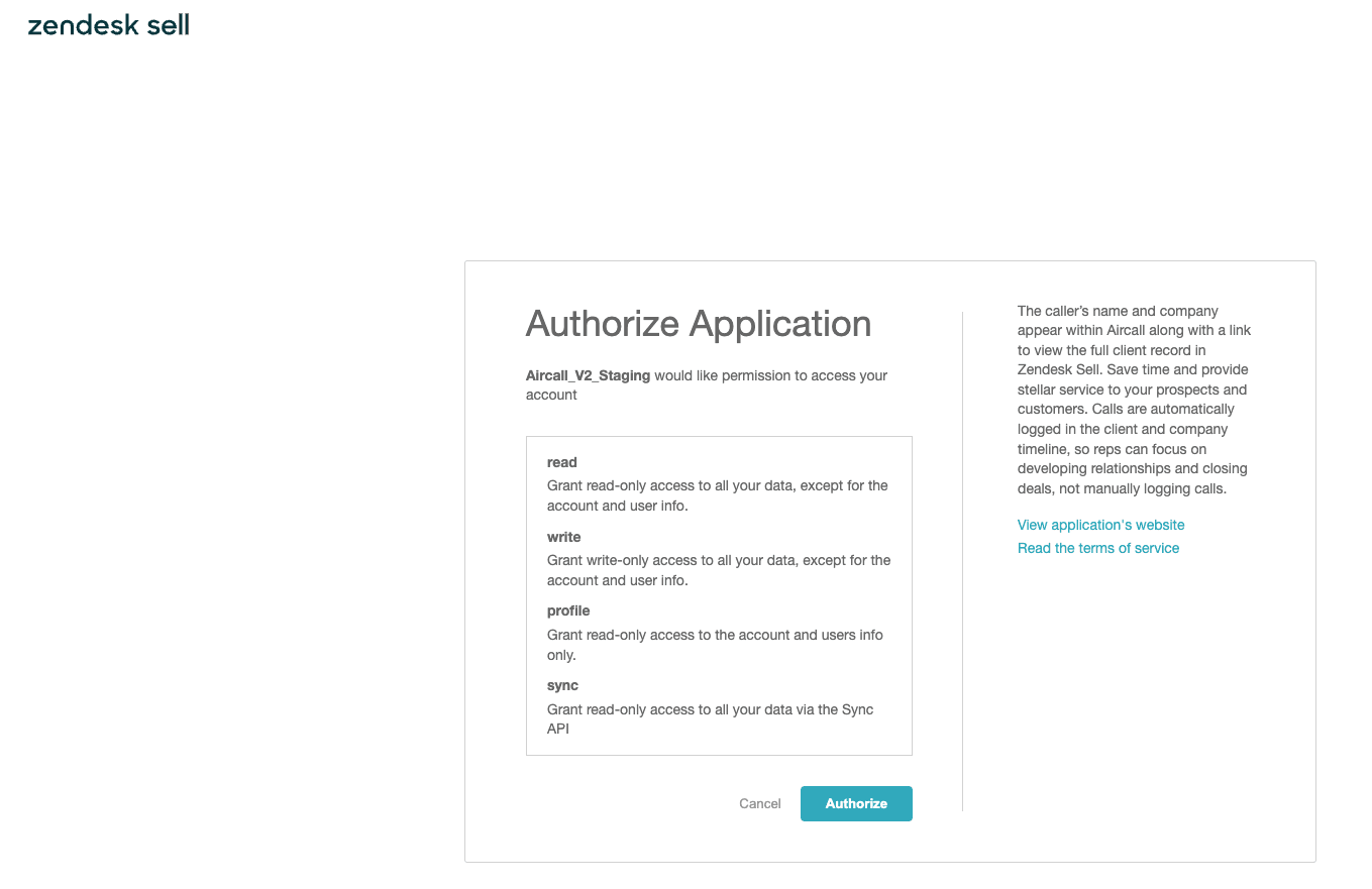 - Lorsque cela vous est demandé, cliquez sur Autoriser pour connecter Aircall à Zendesk Sell.