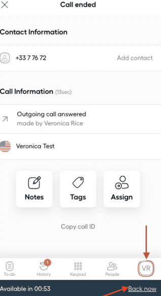 Le minuteur en bas de l'application indiquera combien de temps de clôture il vous reste avant de redevenir disponible pour recevoir des appels. Vous avez également la possibilité d'annuler le temps de clôture en cliquant sur Retour maintenant.