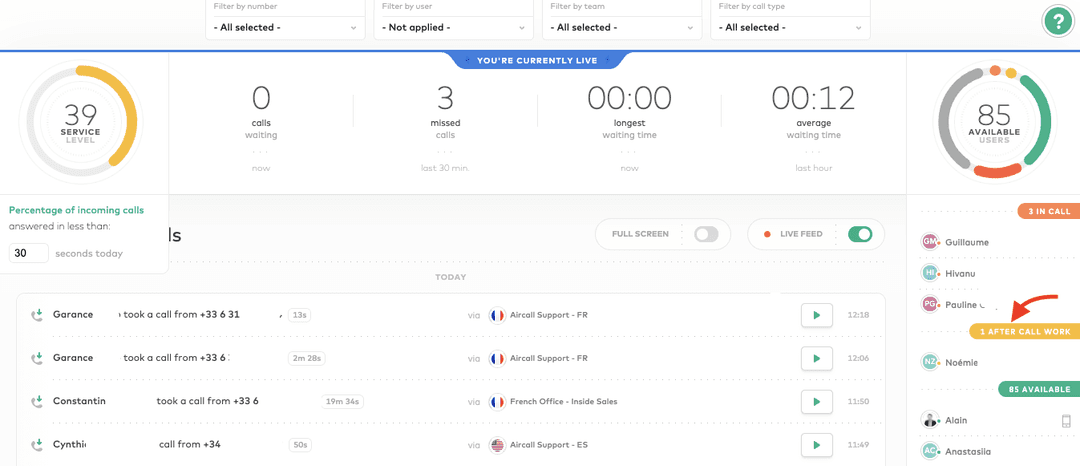 Si vous êtes un utilisateur du plan Professionnel, vous aurez accès à la surveillance en direct d'Aircall . Depuis ici, vous pourrez voir les utilisateurs Aircall qui sont actuellement en temps de clôture ou bloqués dans le tagging d'appel obligatoire depuis la barre de disponibilité. Ils apparaîtront comme en travail après appel.