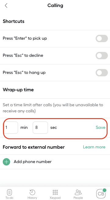 Une fois le paramètre enregistré, votre temps de clôture choisi sera appliqué automatiquement lorsque vous terminez un appel. Pendant que vous êtes en temps de clôture, votre téléphone affichera un minuteur orange sur votre icône utilisateur.