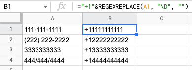Vous avez maintenant des numéros américains formatés en E.164 dans la colonne B.