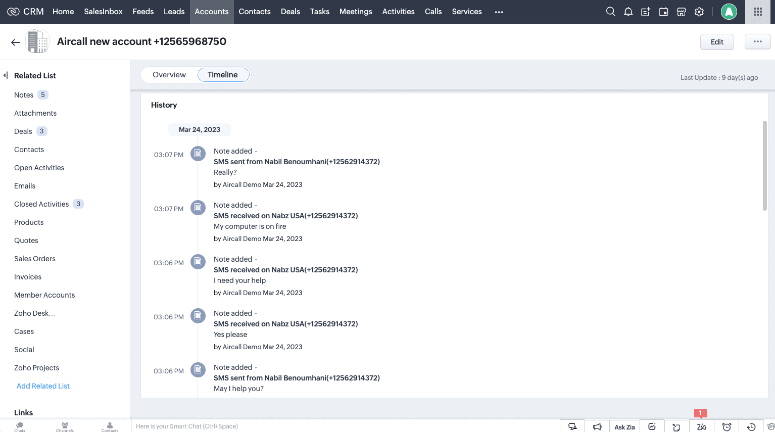 Aircall enregistre également les messages SMS dans Zoho CRM.