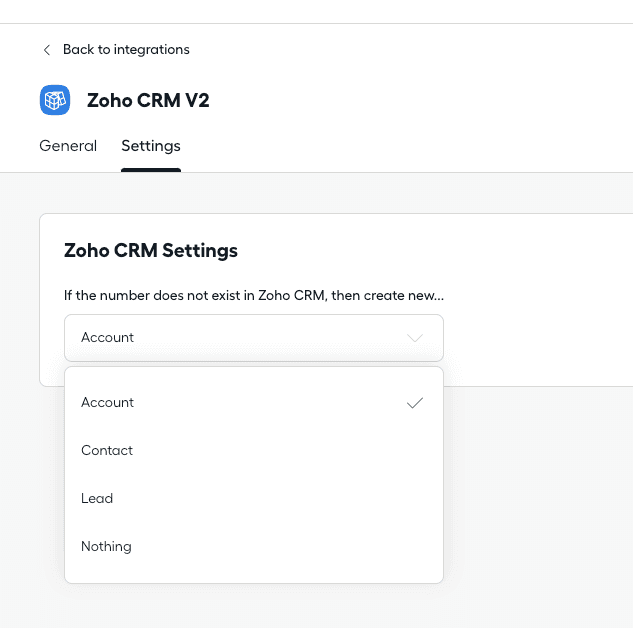 Depuis le tableau de bord Aircall, vous pouvez définir comment Aircall gère les appels provenant de nouveaux numéros. Vous pouvez choisir de créer automatiquement un nouveau Compte, Contact ou Lead dans Zoho CRM, ou choisir de ne prendre aucune mesure.