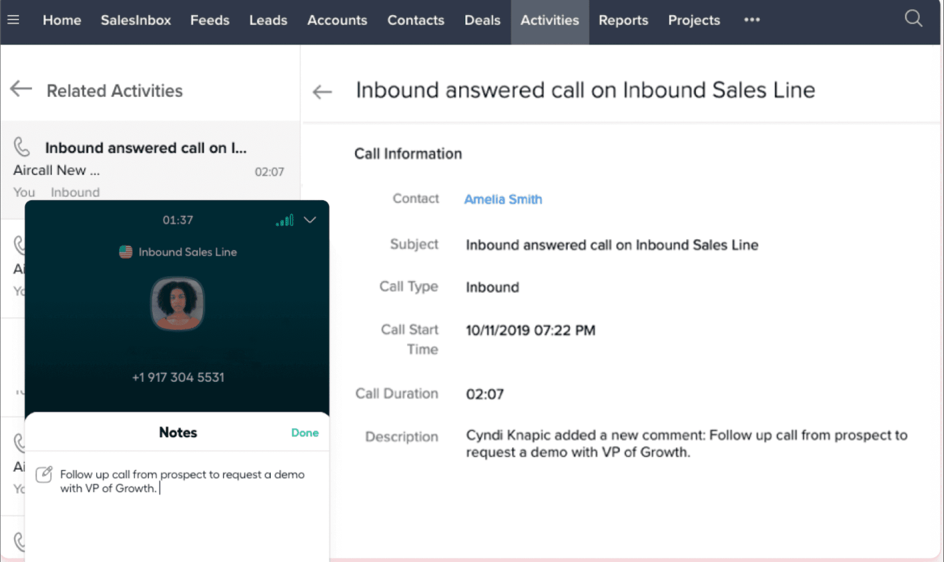 Une fois connecté, Aircall enregistre automatiquement l'activité des appels dans Zoho CRM.