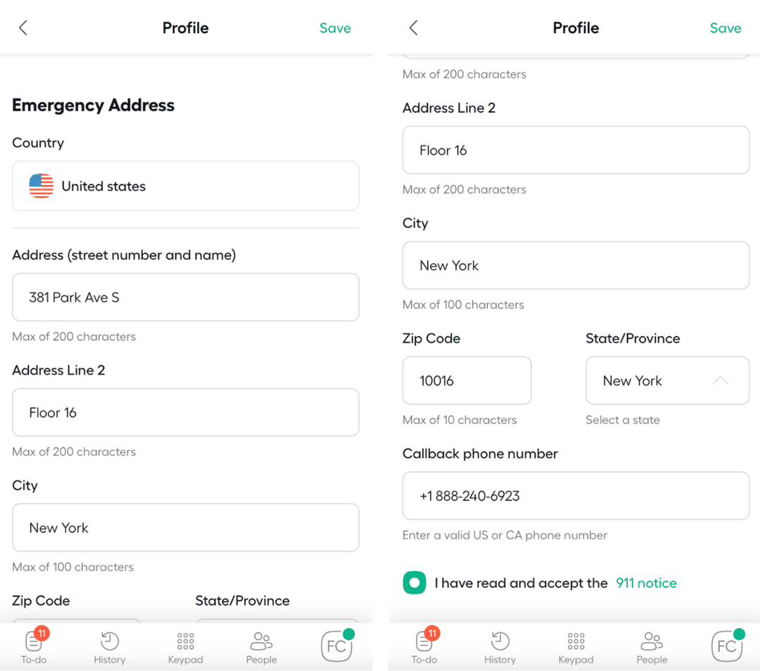 Une adresse d'urgence est requise pour les numéros américains et canadiens. Lorsqu'ils se trouvent aux États-Unis ou au Canada, cette adresse est communiquée aux secours lorsqu'un utilisateur compose le 911. Les utilisateurs doivent fournir une adresse précise et la tenir à jour en permanence.