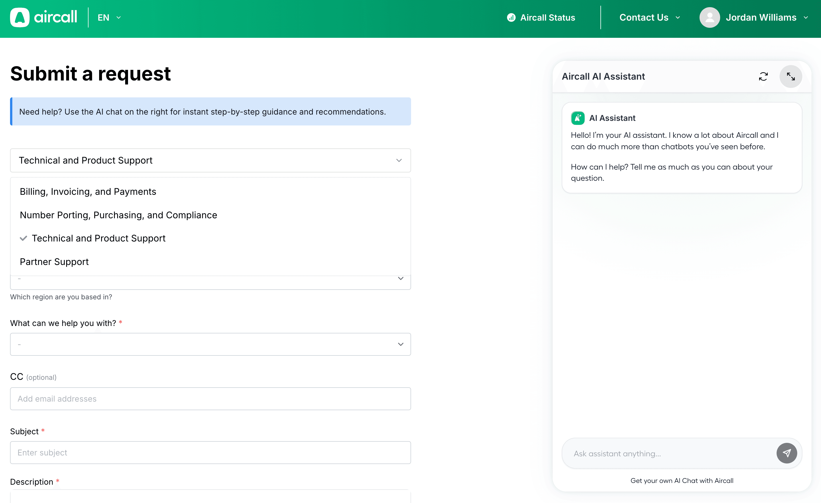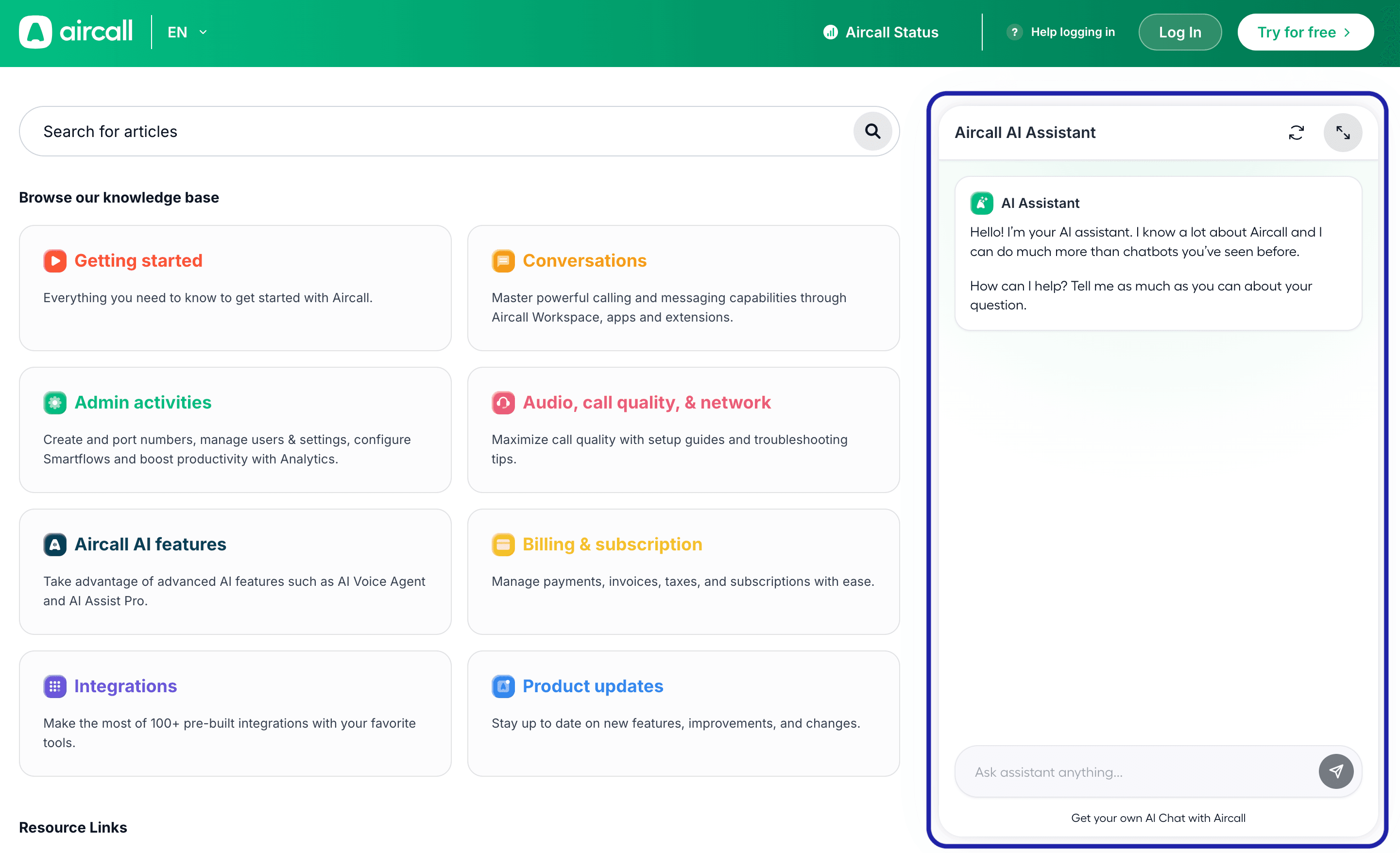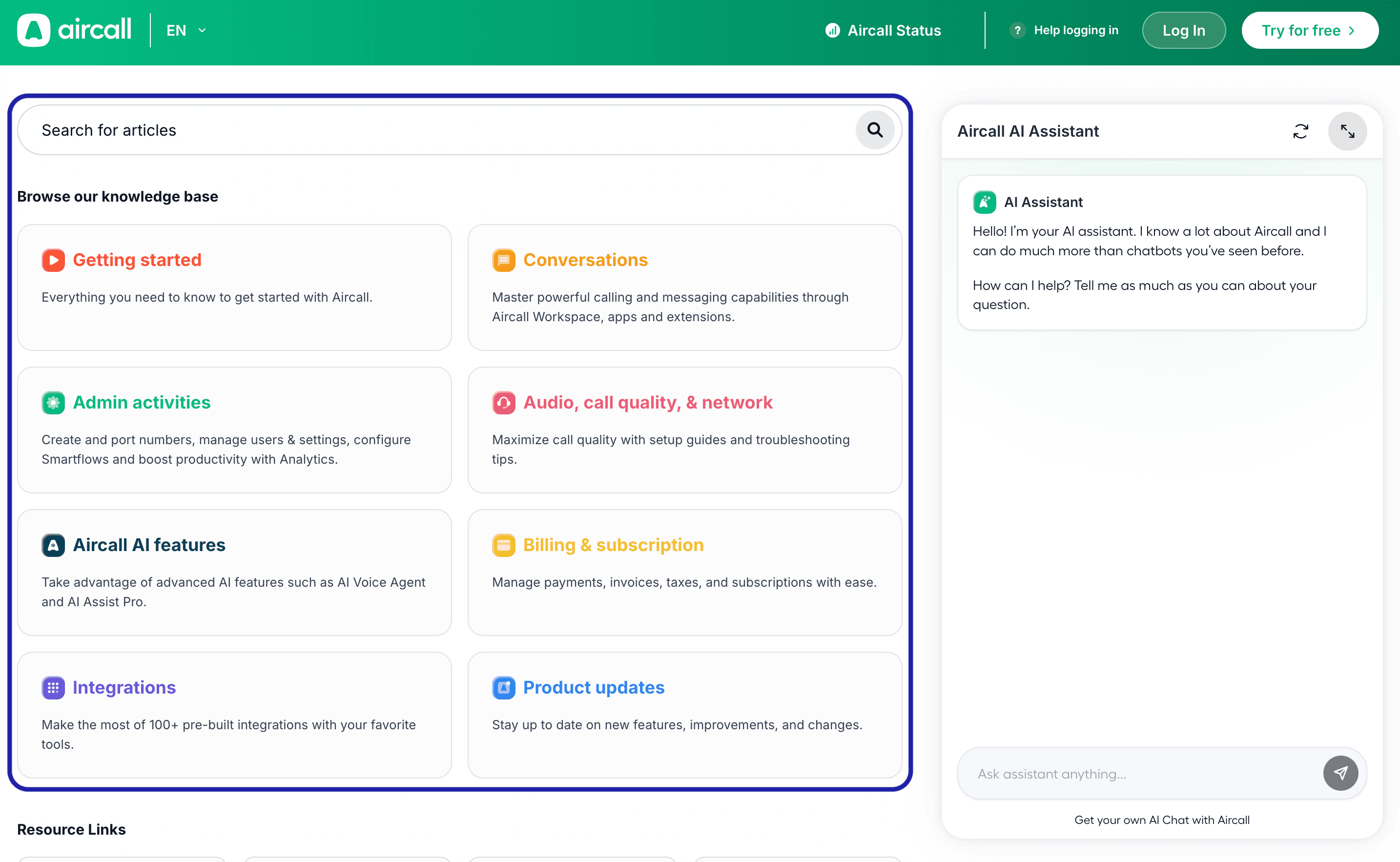 portail d'assistance d'Aircall donne accès à l'assistant IA , à la base connaissances et à une plateforme billetterie pour créer et gérer les demandes d'assistance. Ce guide explique comment accéder à ces fonctionnalités et les utiliser.