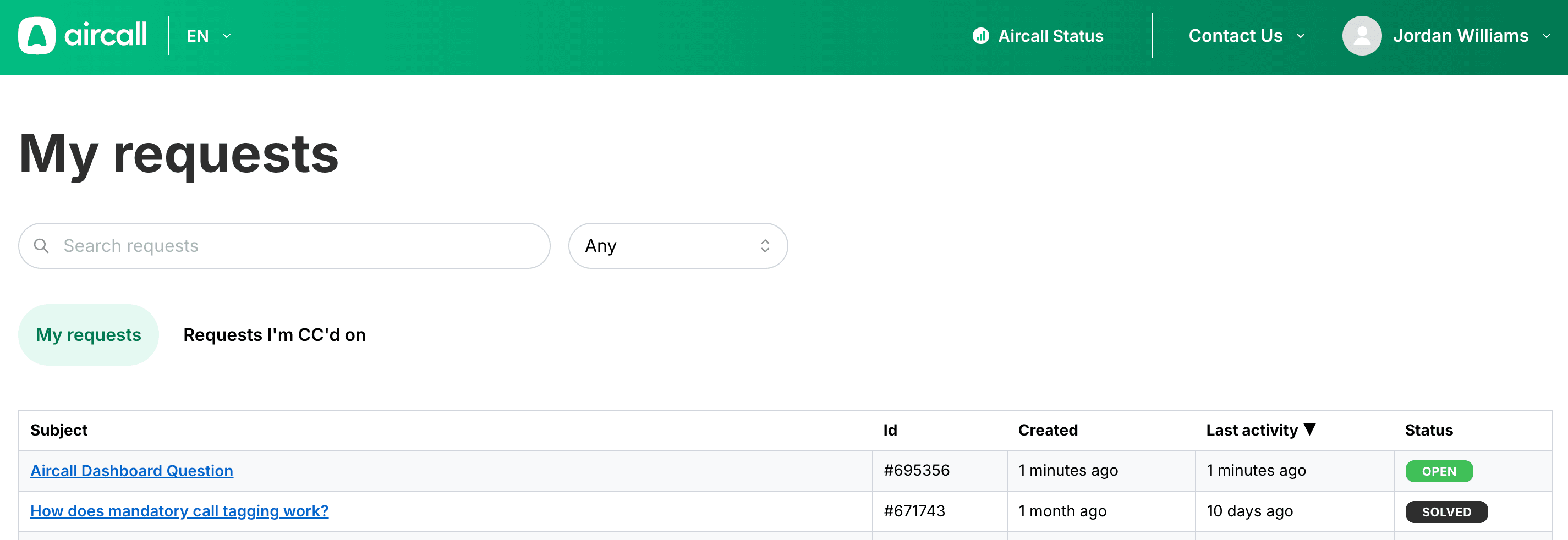 Les propriétaires, administrateurs et superviseurs d'Aircall peuvent créer, mettre à jour et vérifier l'état des demandes d'assistance, de portage et de facturation directement dans le portail de billetterie.