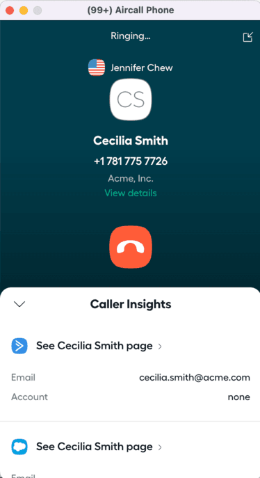 Lors d’un appel émis ou reçu, une Insight Card s’affiche dans Aircall. Cette carte affiche :
