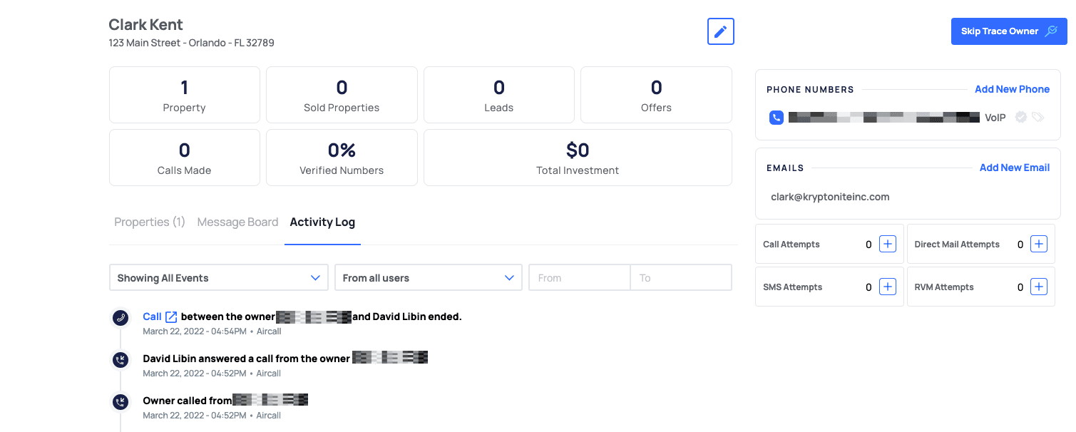 - Lorsqu’un appel est reçu depuis un enregistrement dans REISift, une carte d’informations apparaîtra, affichant des détails clés tels que le propriétaire de l’enregistrement, l’adresse postale et les biens possédés.