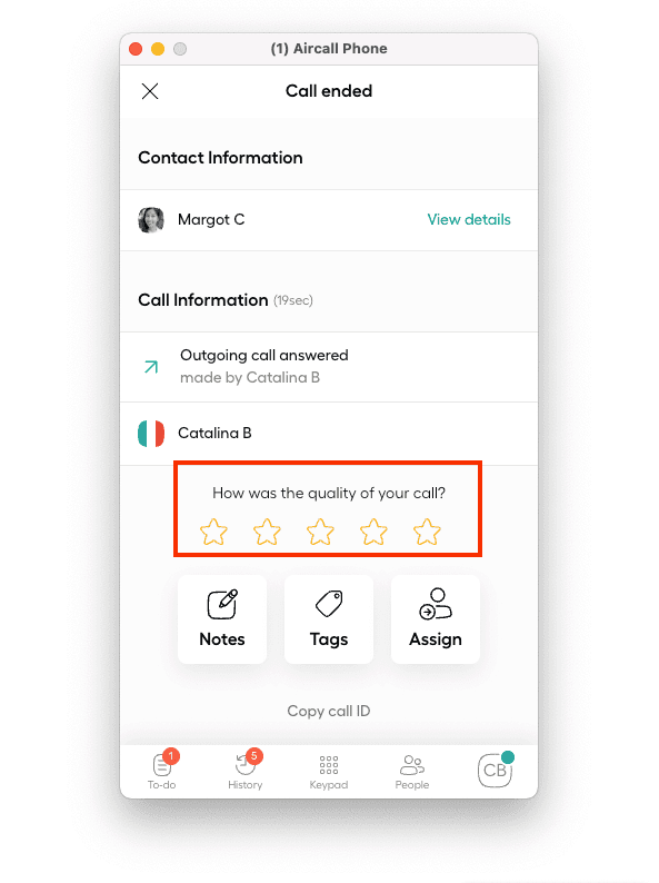 Sur Aircall Phone, vous pouvez attribuer une note aux appels entrants et sortants, que vous soyez sur les applications de bureau, web ou mobile.