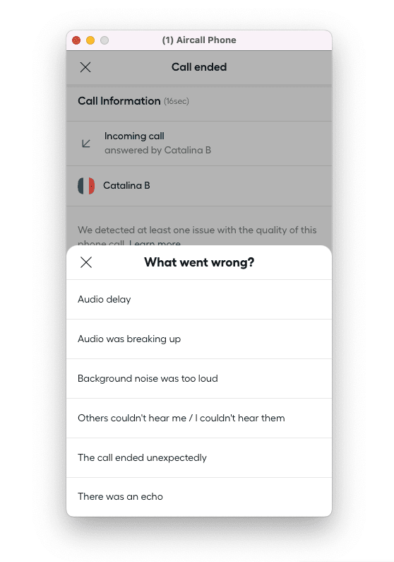 En plus des options pour ajouter des notes, des tags ou assigner l'appel à un coéquipier, vous pouvez également fournir un retour sur la qualité de votre appel dans la vue Appel terminé. Évaluer la qualité de votre appel nous aidera à recueillir plus de détails sur chaque appel.