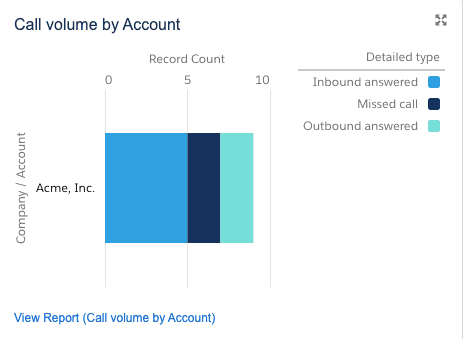 Montre combien d'appels ont été effectués ou reçus vers/depuis chaque compte dans Salesforce. Ce rapport n'inclut pas les appels vers des prospects ou contacts non assignés à un compte.