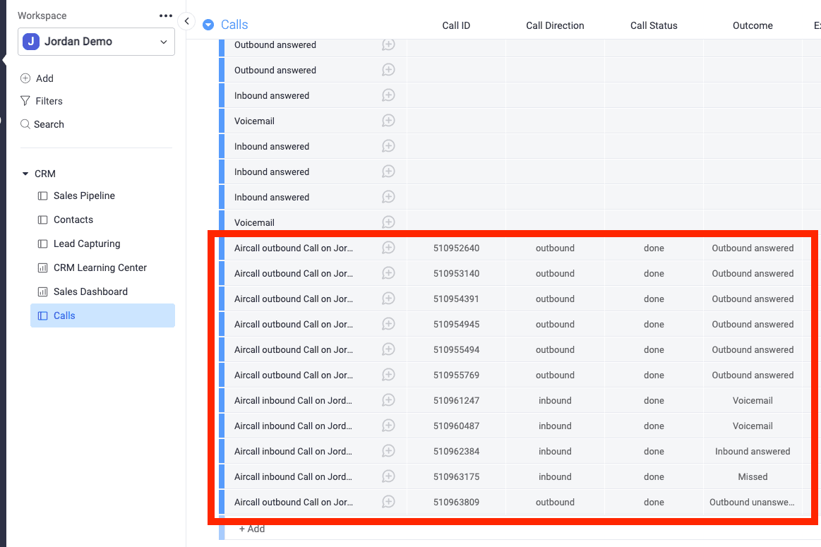 Pour consulter la liste complète de tous les appels, ouvrez le tableau Appels Aircall. Ce tableau fait office de journal complet, tandis que la vue Fiche d'élément est la manière la plus efficace de comprendre les interactions pour chaque contact individuel.