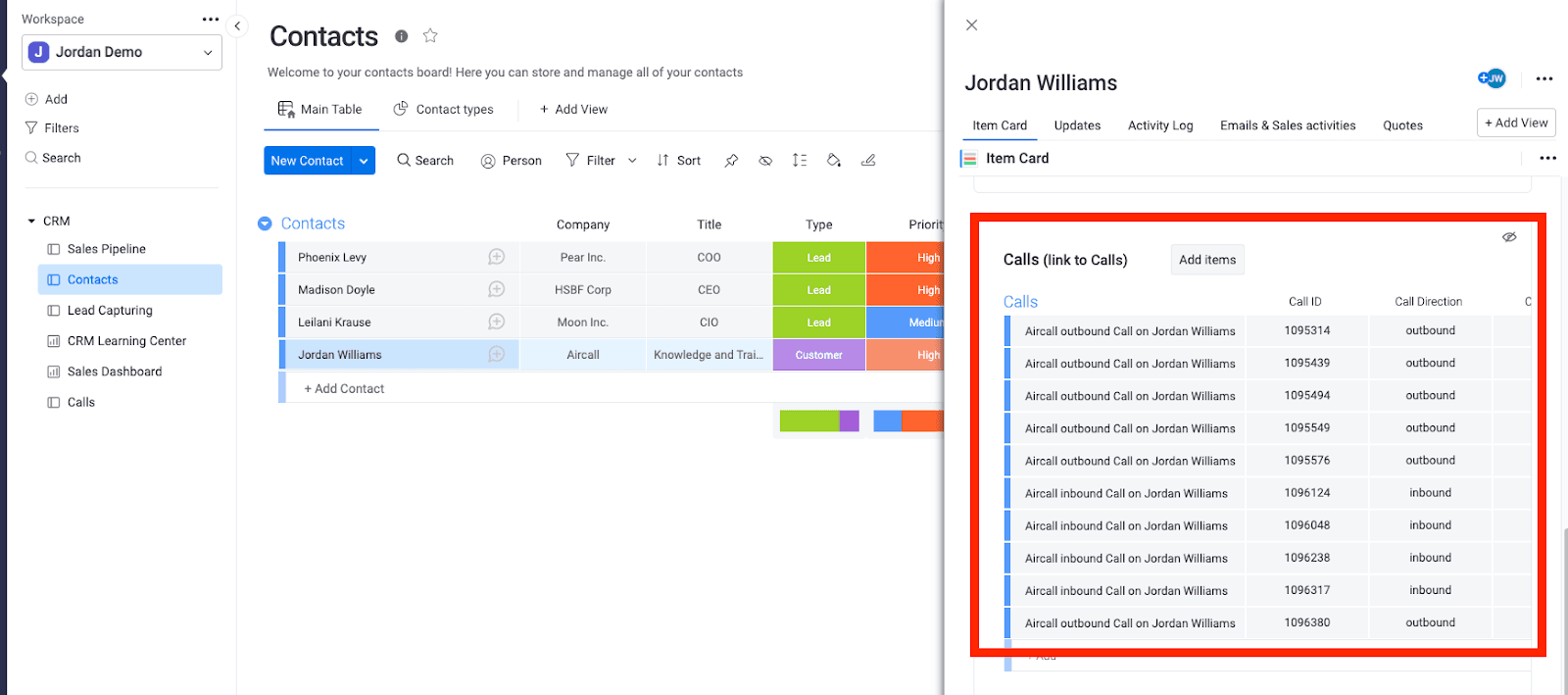 Une fois les recettes d'automatisation installées, l'activité des appels commencera à se synchroniser avec monday.com.