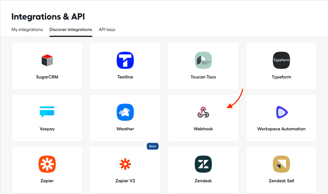 Sélectionnez Webhook dans l'onglet 'Discover integrations' .
