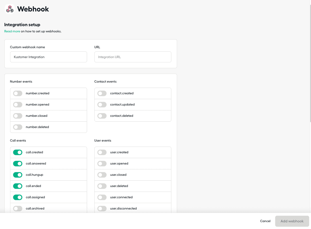 Choisissez les événements Aircall que vous souhaitez enregistrer dans Kustomer. Si vous souhaitez que seuls les appels soient enregistrés, veuillez activer les événements suivants : call.created, call.answered, call.hungup, call.ended et call.assigned.