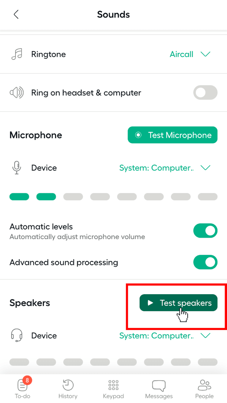 Important: Si vous choisissez d’utiliser les paramètres de votre ordinateur, Aircall suit le périphérique sélectionné dans votre système d’exploitation. Si vous sélectionnez manuellement un périphérique dans Aircall, l’application ignore les paramètres de votre ordinateur et continue d’utiliser le périphérique sélectionné dès qu’il est branché.
