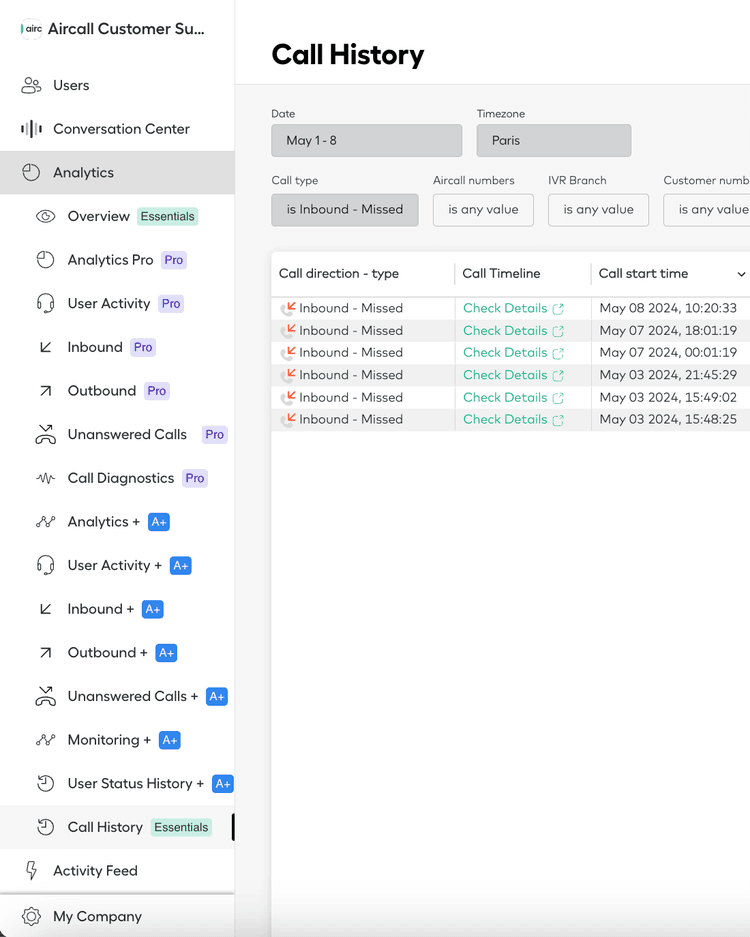 Si vous utilisez le tableau de bord Aircall, vous pouvez utiliser la section Call History pour trouver d'autres appels restés sans réponse. Le filtre "type d'appel" peut vous aider à trouver des appels sans réponse.