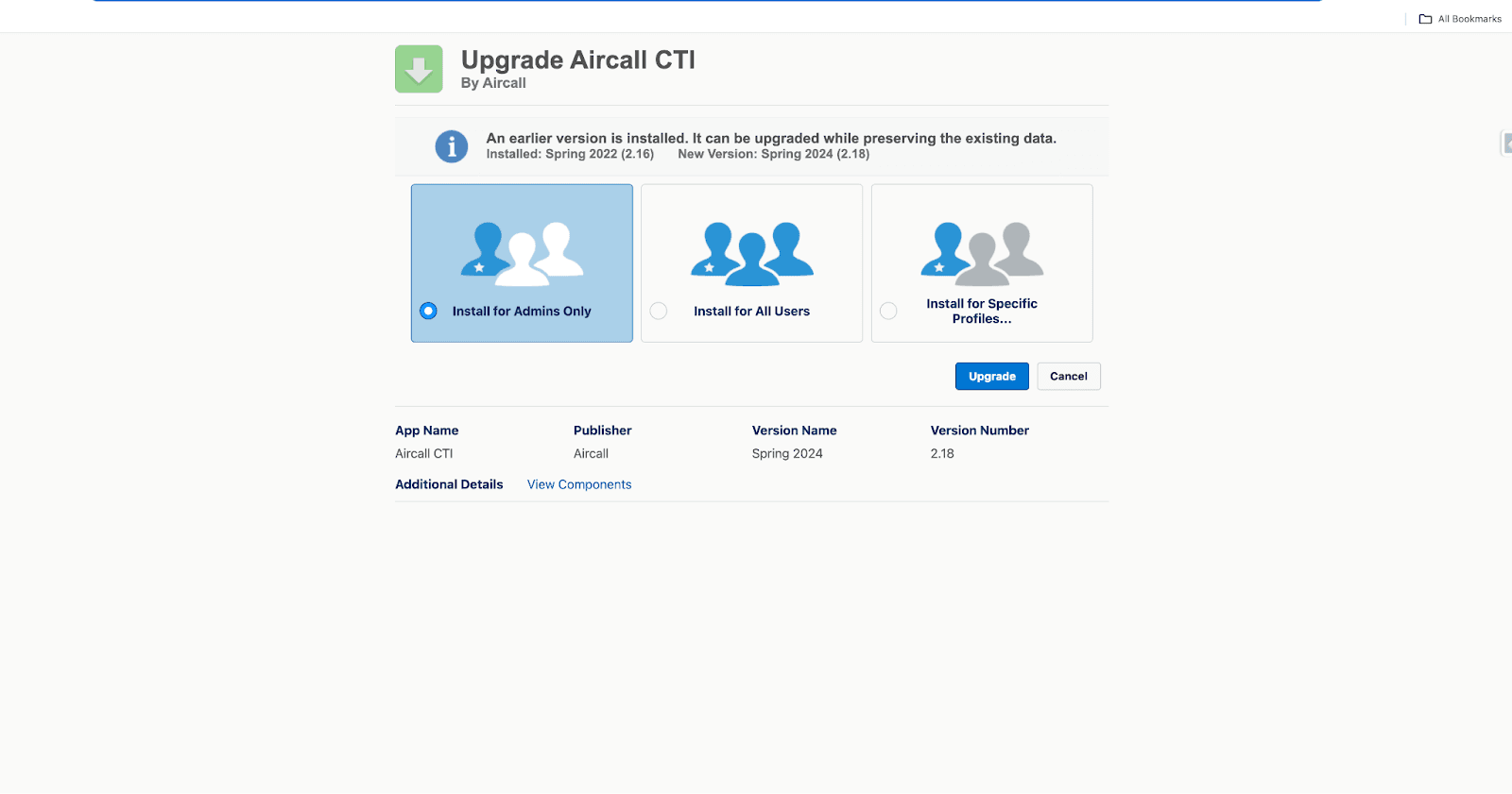 Choisissez Installer pour tous les utilisateurs, puis cliquez sur le bouton Mettre à niveau pour mettre à niveau le package Salesforce.