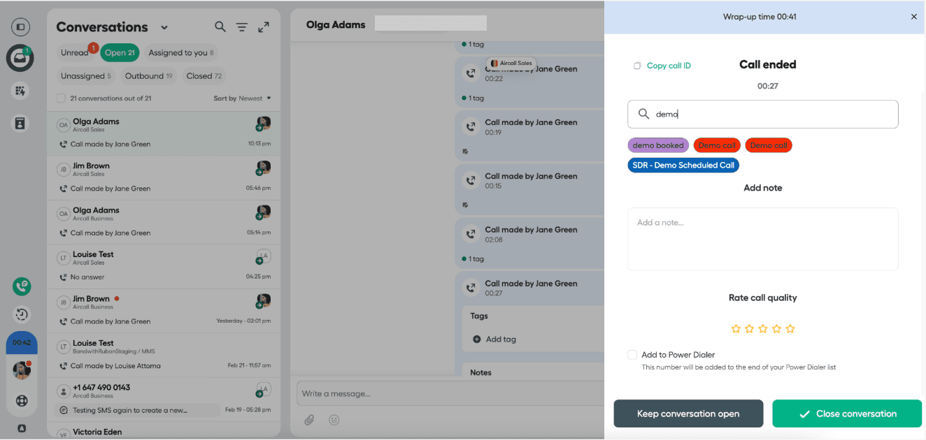 - Vous pouvez ajouter des tags, des notes, évaluer la qualité de l’appel et ajouter le contact à une session Power Dialer.