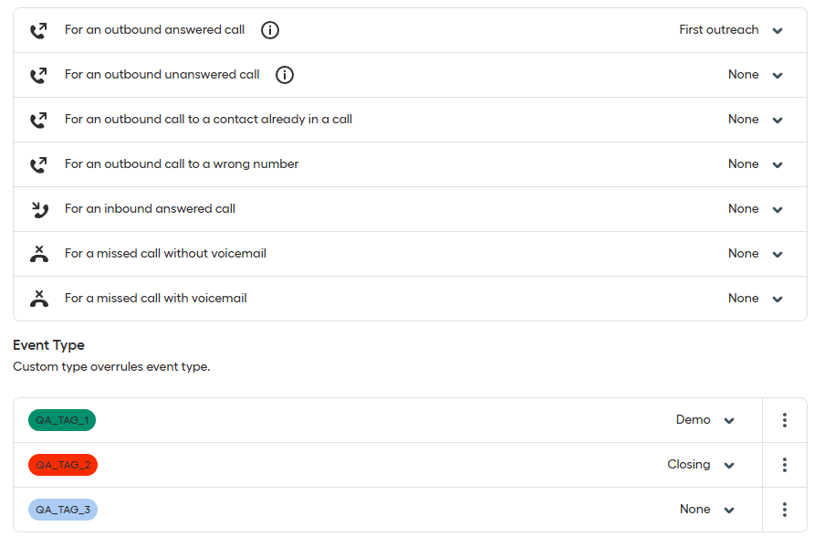 L’intégration Aircall et HubSpot vous permet de définir dynamiquement le type d’engagement d’appel HubSpot en fonction des tags Aircall. Cette configuration est gérée dans la section Type d’événement des paramètres d’intégration et vous permet de remplacer les règles par défaut du type d’appel HubSpot lorsque des tags spécifiques sont appliqués à un appel.